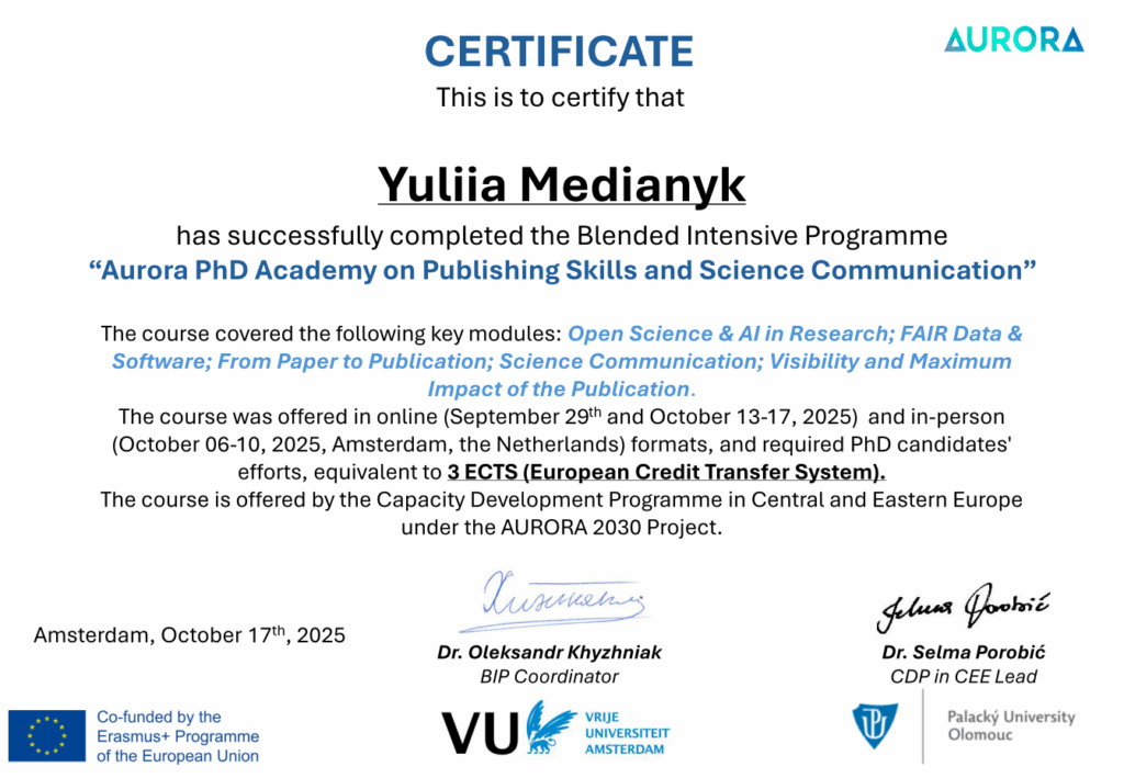 Викладач закладу вищої освіти кафедри економіки та менеджменту економічного факультету Юлія МЕДЯНИК та здобувач третього (освітньо-наукового) рівня вищої освіти економічного факультету пройшли стажування за програмою академічної мобільності Програмою ЄС Еразмус+ (Blended Intensive Programme) в Амстердамському вільному університеті (Нідерланди). Курс охоплював такі основні модулі: Open Science & AI in Research; FAIR Data & Software; From Paper to Publication; Science Communication; Visibility and Maximum Impact of the Publication.