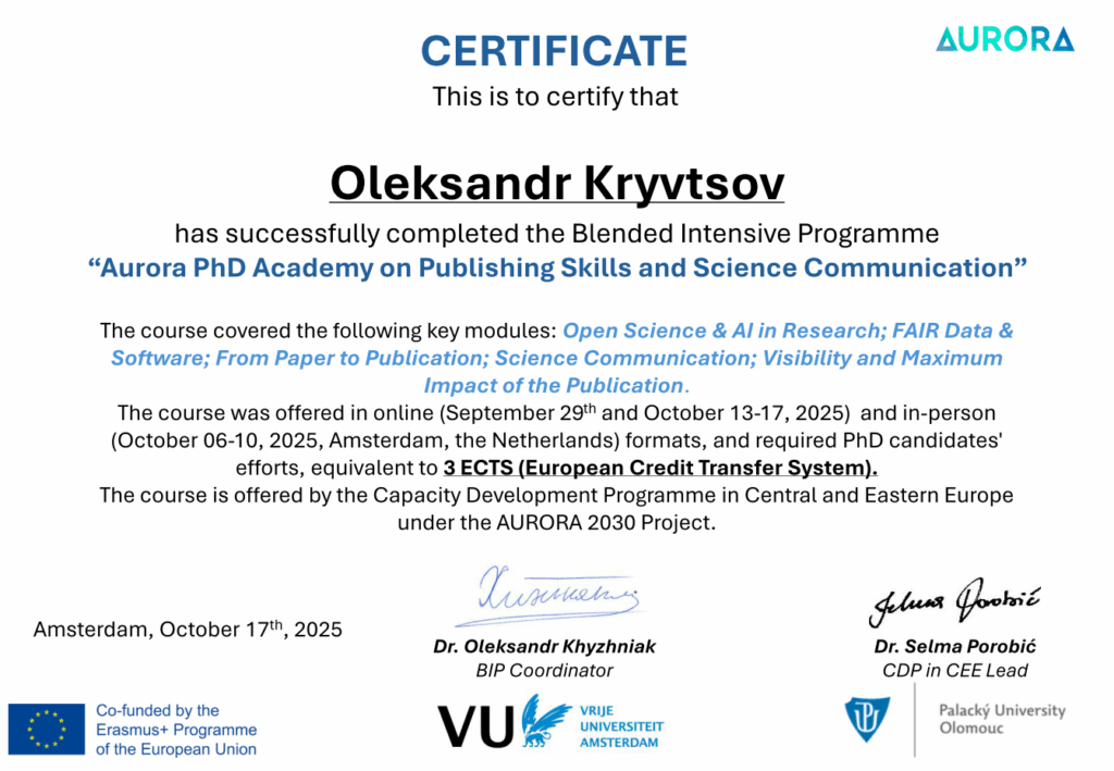 Участь у стажуванні за програмою академічної мобільності Програмою ЄС Еразмус+ (Blended Intensive Programme) в Амстердамському вільному університеті (Нідерланди) у період з 6 по 10 жовтня 2025 року