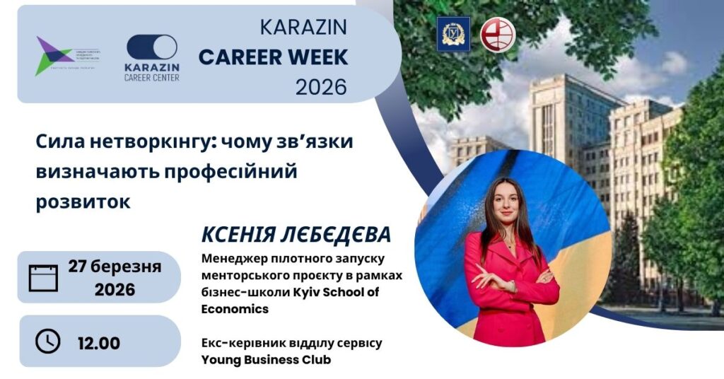 27 березня 2026 року в рамках KARAZIN CAREER WEEK 2026 кафедра маркетингу, менеджменту та підприємництва запрошує приєднатися до зустрічі з випускницею освітньої програми «Маркетинг» Лєбєдєвою Ксенією, менеджеркою пілотного запуску менторського проєкту в рамках бізнес-школи Kyiv School of Economics, екс-керівницею відділу сервісу Young Business Club.